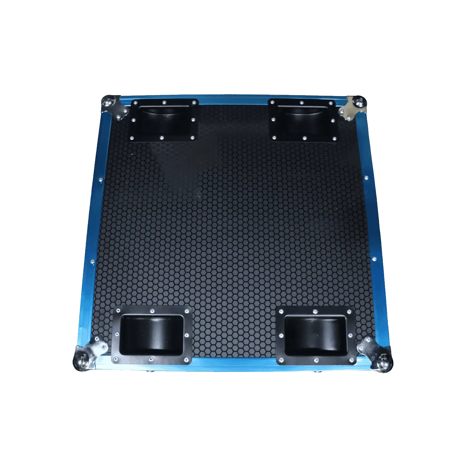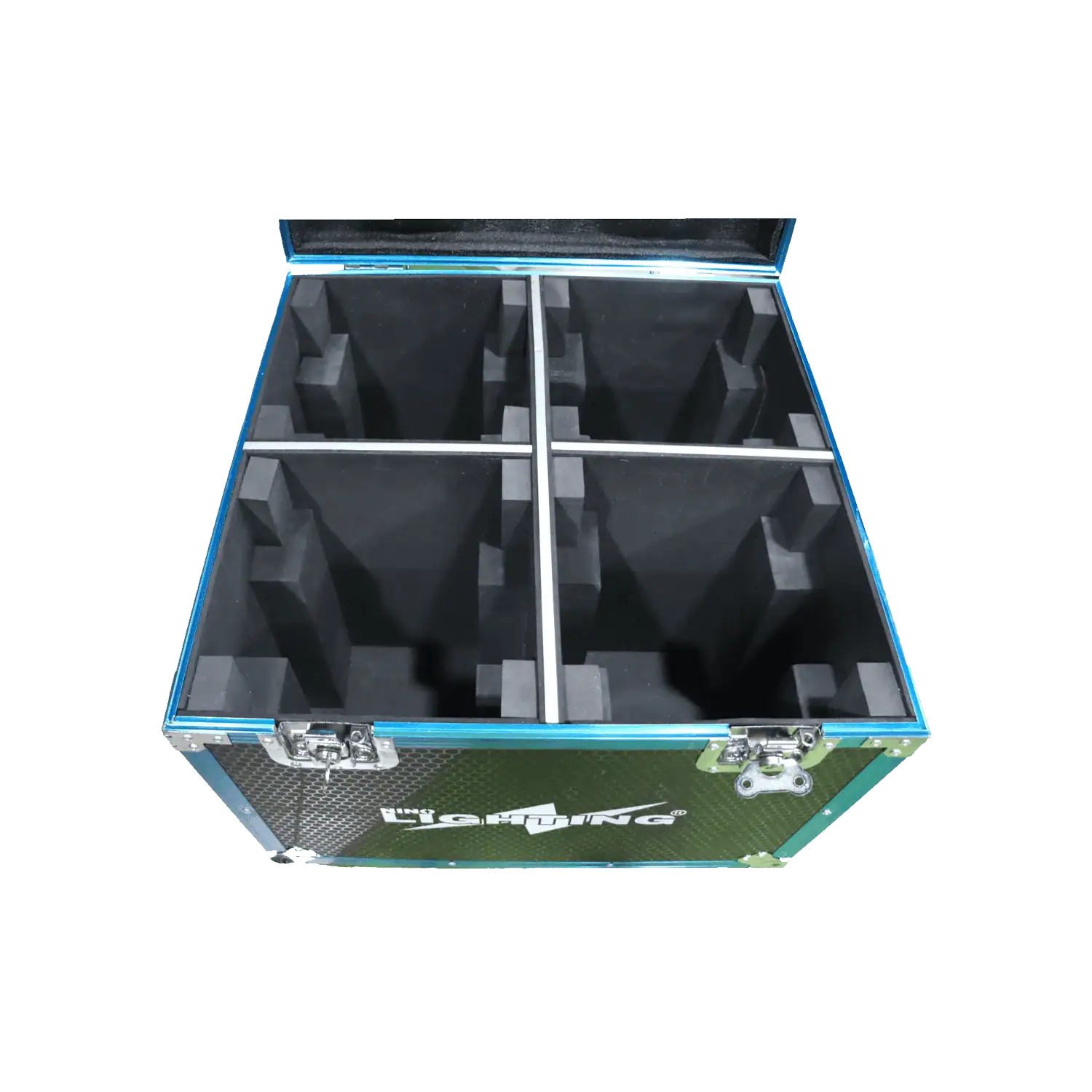 Baule Vuoto Flight Case rigido e resistente per il trasporto di 4 Teste Mobili Sophie LED 2.0 7x40w Aprendo il baule avremo ben 4 spazi vuoti per le Sophie LED. Il baule si presenta con bordi in alluminio resistenti, maniglie laterali e chiusure a farfalla. Il Design del baule è davvero particolare realizzato con rifiniture colore blu e fatto con design nido d’ape. La testa mobile Sophie LED 2.0 la puoi acquistare direttamente da qui.