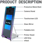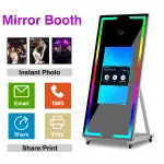 Cabina Fotografica Mirror Photo Booth con rotelle per facile trasporto, Prodotto Esclusivo LAMPOSHOP con specchio magico da 65 pollici con touch screen da 32 pollici Per Scattare Foto Video. Configurata con diverse lingue può essere collegata a una stampante per stampare foto. Al suo interno del pannello Il mirror Photo Booth ha un mini pc con processore Intel i5 con 8GB di RAM con sistema operativo Windows 10pro. Il software di base è DSLRBooth un app capace di stampare foto, gif e boomerang già installata. La risoluzione del display è 1080×1920 Schermo LED HD .